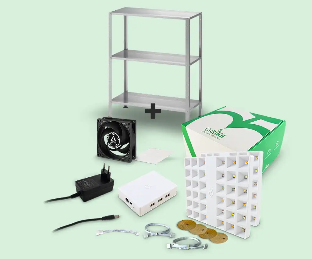CultiKit er en Plug & Grow løsning med tre effektive 18W fuld spektrum vækstlys og lavt strømforbrug. Med CultiApp kan du styre lys, ventilatorer og pumper til perfektion. Nem at integrere under hylder, i skabe, reoler mv. Kun fantasien sætter grænser.