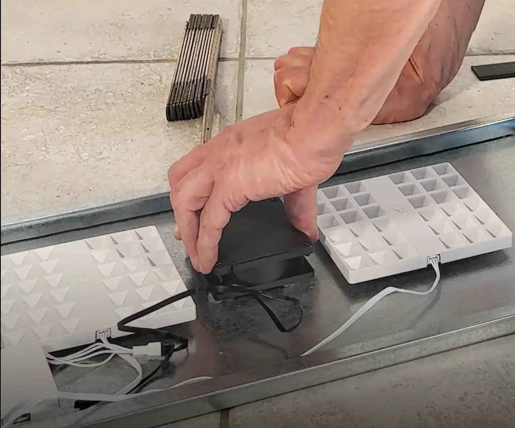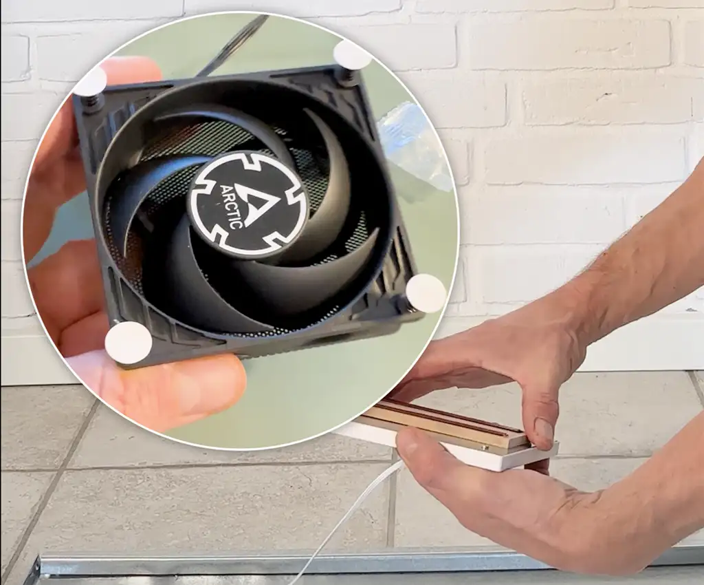 💡 Bruger du en ekstra ventilator (til 2 niveauer)? Så skal du kun bruge to skrue (så fans sidder vinklet mod midten).