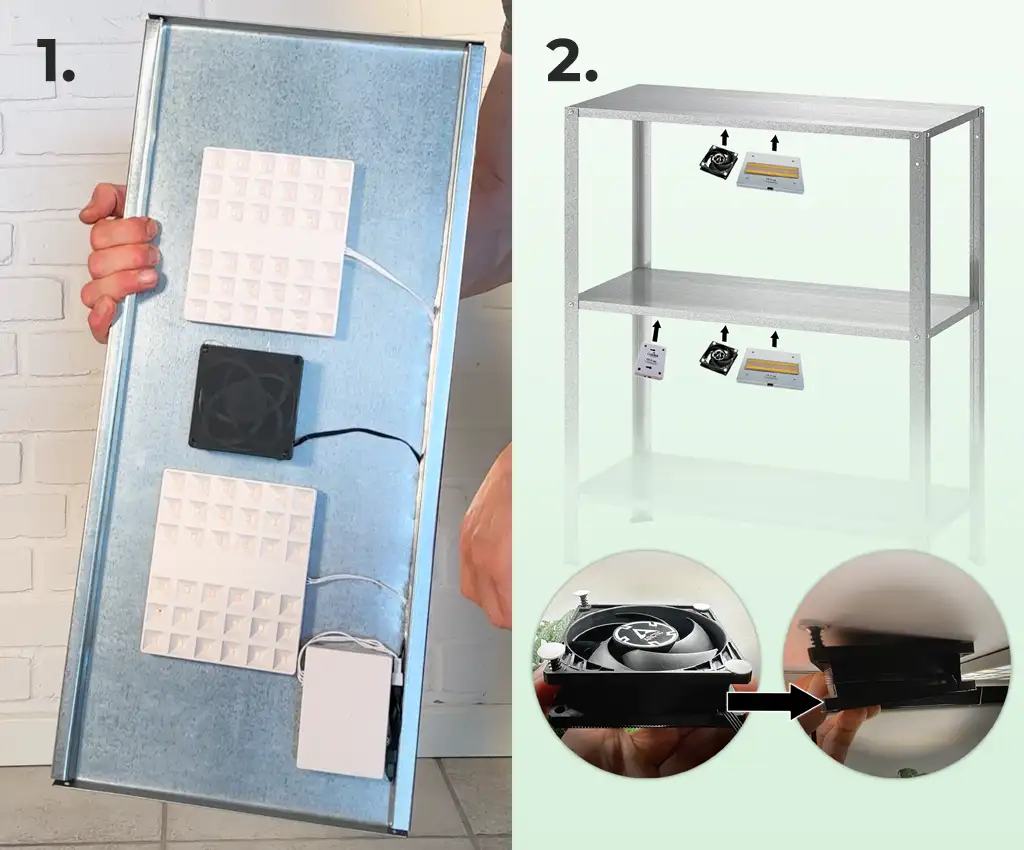 Fastgør LED panler, ventilator(er) og controller.