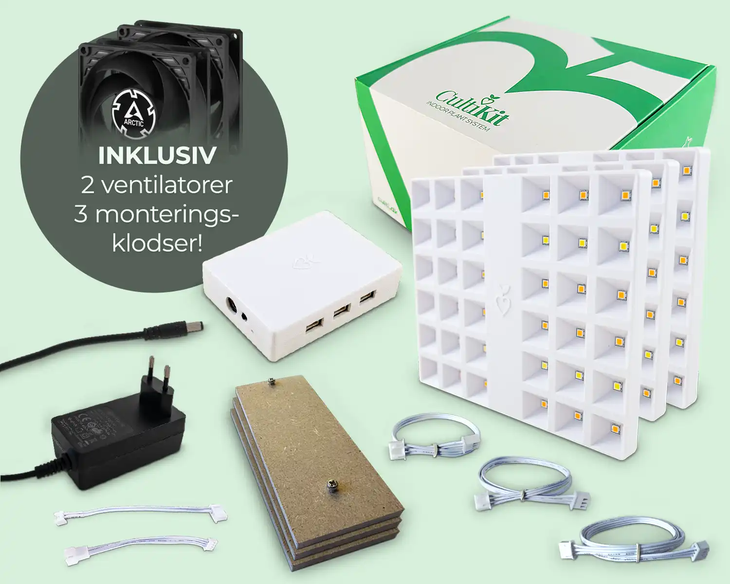 CultiKit Standard HACK er vores standardpakke – nu med selvklæbende monteringsklodser, så du kan installere sættet hvor som helst. Passer perfekt i det store IKEA Åkerbär drivhus og fungerer også rigtig godt i hyldesystemer som IKEA Hyllis og andre setups, hvor du vil have 3 LED paneler og 2 ventilatorer i spil.