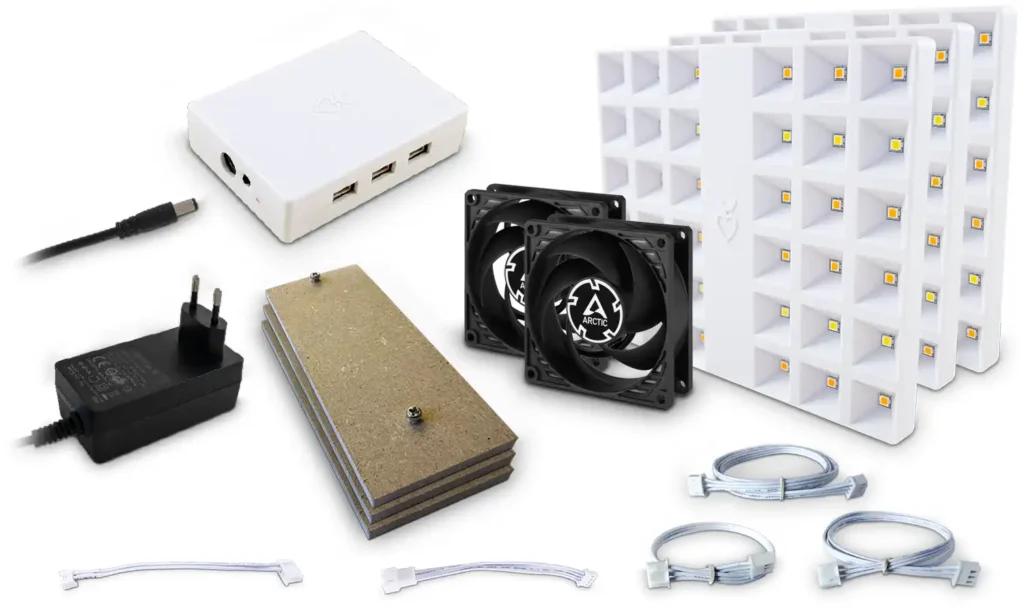 Med CultiKit Standard HACK får du en smart controller inkl. 3 stk. 18W fuld spektrum vækstlys, 2 stk. monteringsklodser til vækstlys, 2 stk. PWM-ventilatorer, alle nødvendige kabler og en strømforsyning.