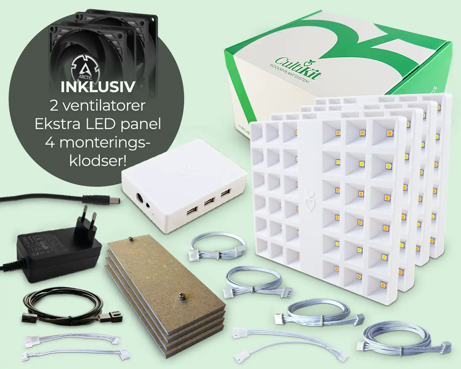 Se den fulde CultiKit præsentation med 3 LED paneler og 2 ventilatorer.