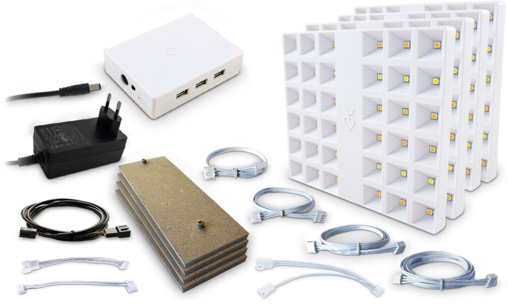 Med CultiKit Standard HACK får du en smart controller inkl. 4 stk. 18W fuld spektrum vækstlys, 4 stk. monteringsklodser til vækstlys, 2 stk. PWM-ventilatorer, alle nødvendige kabler inklusiv 120 cm forlænger kabler til både LED paneler og ventilatorer samt en strømforsyning.